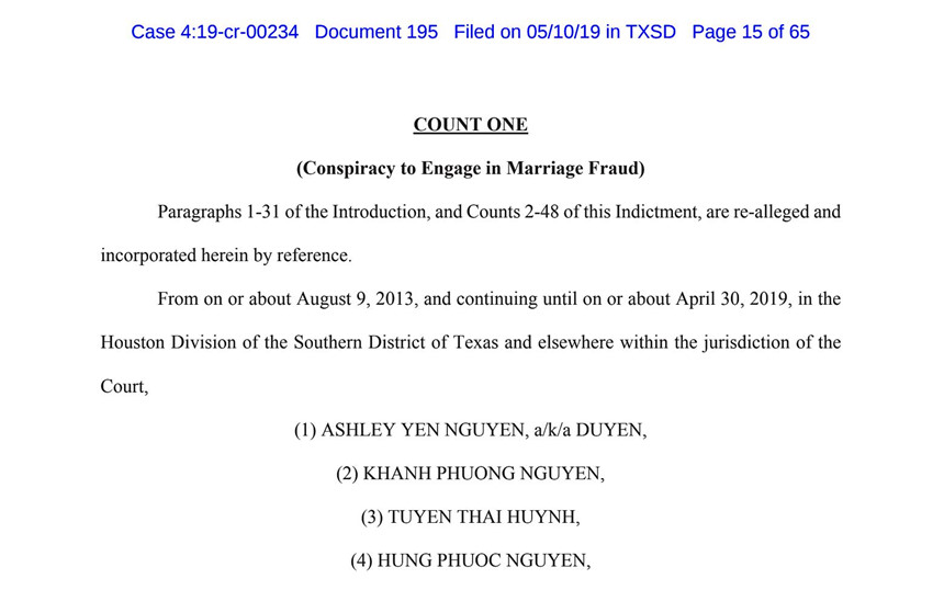 Hồ sơ cáo trạng đường dây kết hôn giả do người gốc Việt cầm đầu ở Houston, Texas.