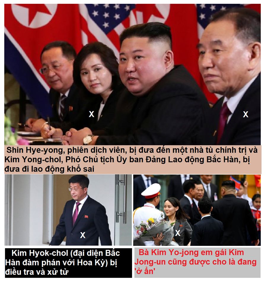 Người đứng bên trái TT Trump là ông Kim Yong-chol là Phó Chủ Tiệm Đảng Lao Động Bắc Triều Tiên và bên phải là bà Kim Song-hye Chủ tịch ủy ban thương lượng nguyên tử Bắc Triều Tiên - Cả hai người này và 3 viên chức khác đã bị Kim Jong Ủn lôi ra ngoài sân bay quân sự xử tử bằng súng đại liên và súng phóng lựu B40 sau khi từ Hà Nội về nước.