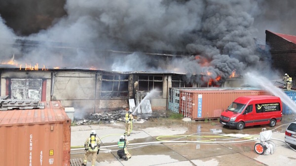 Ngọn lửa được cho là bùng phát từ một trong những container cạnh kho chứa hàng lớn. Kho hàng này chứa giày dép, mỹ phẩm, quần áo và hóa chất. (Ảnh: TTXVN)