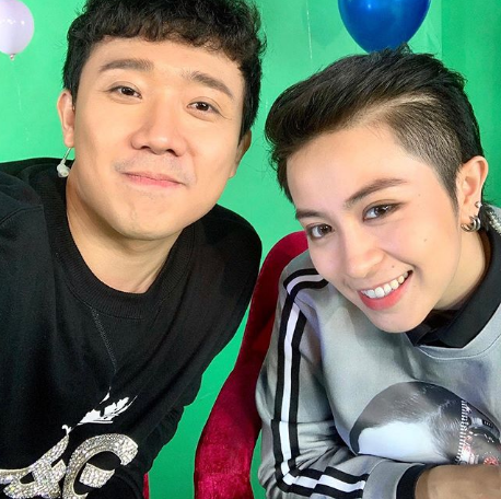 Trấn Thành hào hứng "đọ sắc" với Gil Lê trong hậu trường một chương trình.