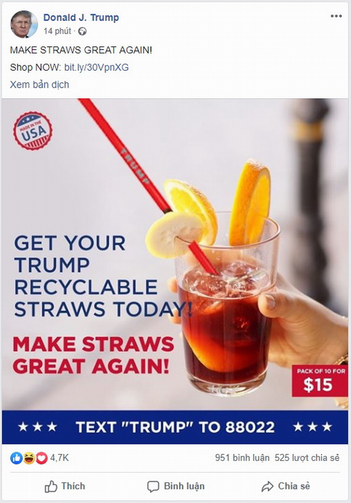 Cách đây 14 phút, tổng thống Trump lên mạng xã hội rao bán trà chanh đá với giá mỗi ly 15 USD. Không biết có tính phí giao hàng hay chưa, nhưng giá 15 USD thì uống xong sẽ "chát" hết cả mồm. Chắc tổng thống tự tay làm, tự tay pha chế, đề hẳn là Made in USA nên mới giá cao như vậy. Chúc tổng thống đắt khách.