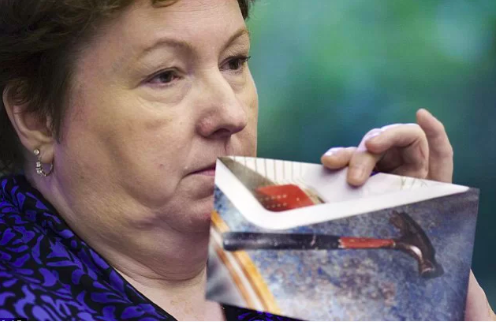 Susan Kuhnhausen cùng ảnh chụp chiếc búa của sát thủ. Ảnh: AP.