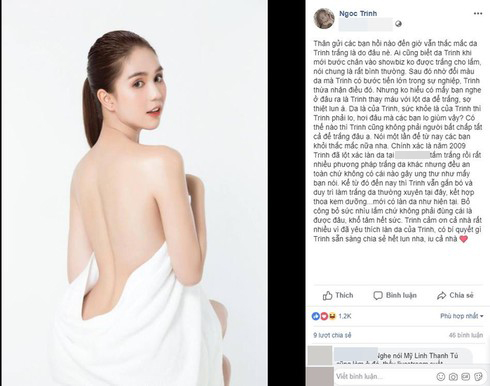 Có thế nào thì Trinh cũng không phải người bất chấp tất cả để trắng đâu ạ. Nói một lần để từ nay các bạn khỏi thắc mắc nữa nha. Chính xác là năm 2009, Trinh đã lột xác làn da, tắm trắng rồi rất nhiều phương pháp trắng da khác nhưng đều an toàn chứ không có cái nào gây ung thư như mấy bạn nói”.