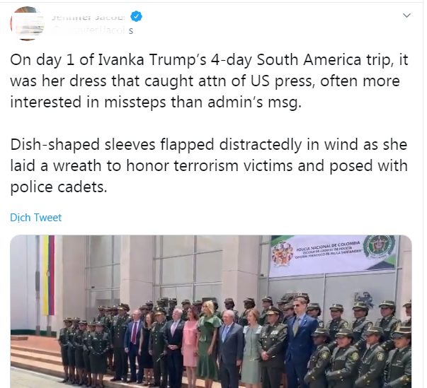 Nhưng mọi thứ bắt đầu có gì đó sai sai khi Ivanka bước ra ngoài trời. Trong lúc chụp ảnh với Phó Tổng thống Colombia Marta Lucia Ramirez, Bộ trưởng Bộ Quốc phòng Guillermo Botero và Thứ trưởng Ngoại giao Hoa Kỳ John J. Sullivan, hai bên tay áo của Ivanka được dịp ‘tung xòe’ như lá rơi mùa thu.