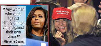 Có lẽ vì vậy nên nhân vụ Tổng Thống Trump vì phải bảo vệ sự tôn kính quốc kỳ và quốc ca Hoa Kỳ, nên Ông đã yêu cầu chủ đội bóng NFL (National Football League/ Đội Bóng Bầu Dục Quốc Gia) hãy sa thải những cầu thủ “chó đẻ” đã quỳ gối khi chào cờ quốc gia Mỹ. Tổng Thống Trump đã bị ông chủ NFL phê rằng Tổng Thống Trump đã xúc phạm đến uy thế của đội tuyển quốc gia! Bà Hillary thừa cơ hội nhẩy vào ăn ké “đánh hôi” một cái cho hả nỗi đau cơn giận thua cuộc, và với bản năng “bắt chước như Khỉ” của cựu Đệ Nhất Phu Nhân, bà Michelle Obama liền nhẩy tưng lên phê rằng “Any woman who voted against Hillary Clinton voted against their own voice.” – “Bất cứ phụ nữ nào đã bỏ phiếu chống Hillary Clinton đều là người đã bỏ phiếu chống lại chính tiếng nói của riêng họ.” .