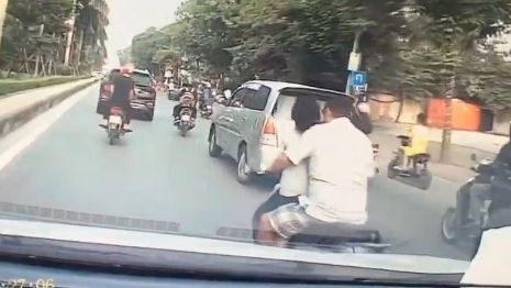 Đoạn clip ghi lại cảnh ông bố chở 2 con gái đi học, trên đầu không đội mũ bảo hiểm và đứng trong tư thế cực kỳ nguy hiểm khiến dân mạng phải "toát mồ hôi". Cụ thể, thay vì để các con ngồi phía sau xe, người đàn ông để hai bé gái đứng trước mặt và vòng tay, vặn ga.