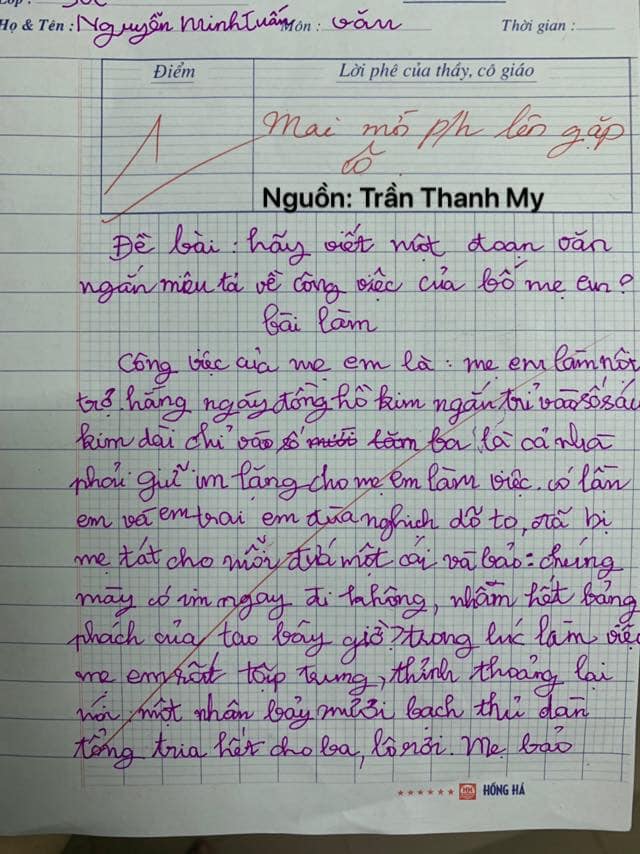 Bài văn tả công việc bố mẹ khiến dân mạng cười ngất. (Ảnh: Thanh Hoài Thanh)