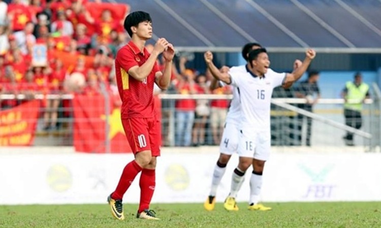 Công Phượng tiếc nuối sau khi đá hỏng phạt đền ở trận thua Thái Lan 0-3 tại vòng bảng SEA Games 2017. Ảnh: Đức Đồng.