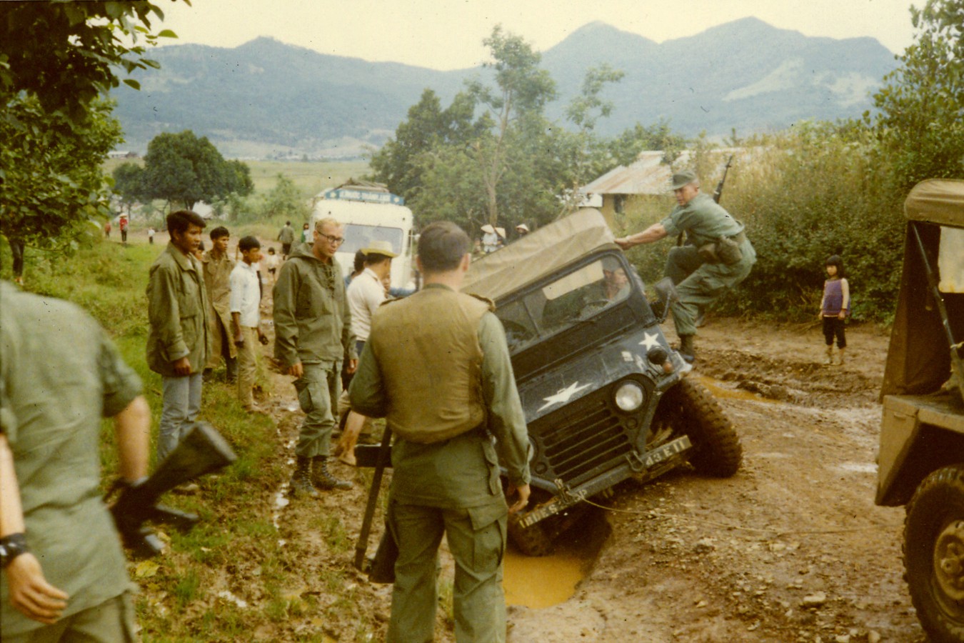 Binh sĩ Mỹ "giải cứu" chiếc xe quân sự bị kẹt trong hố nước ở quốc lộ 20. Ảnh: Tom Petersen.