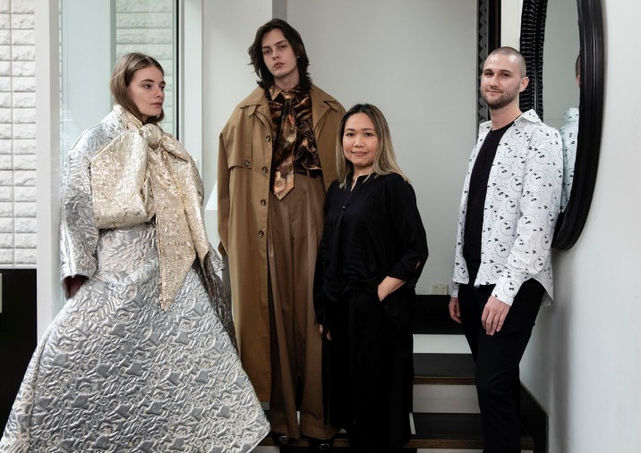 Kim Clark (áo đen) và Domenic Roylance (áo trắng), người đồng chiến thắng học bổng của AUSFF, cùng các người mẫu trình diễn những thiết kế của họ. Ảnh: SMH