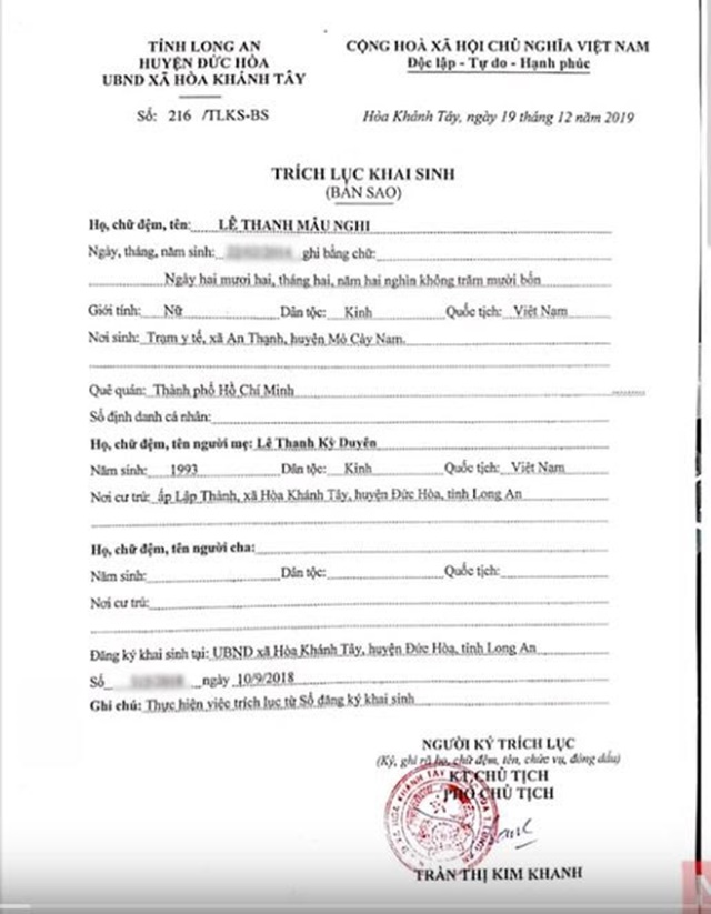 Giấy khai sinh được cho là của Ph. á p Tâm