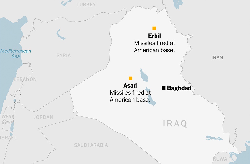 Hai căn cứ của Mỹ ở Iraq bị Iran nã tên lửa. Đồ họa: New York Times.