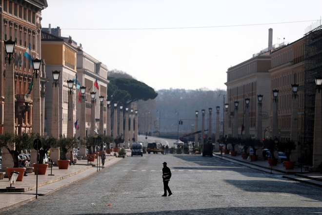 Người đàn ông băng qua đường ở Via della Conciliazione tại Rome, Italy. Ảnh: Reuters.