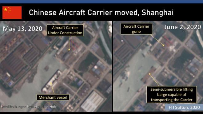 Các nguồn tin tình báo gần đây phát hiện con tàu này biến mất khỏi công xưởng ở Thượng Hải, mặc dù chưa xong các bước hoàn thiện. Qua hình ảnh vệ tinh, các chuyên gia cho rằng, tàu sân bay Trung Quốc có thể được di chuyển ra khỏi công xưởng từ ngày 25-28/5.