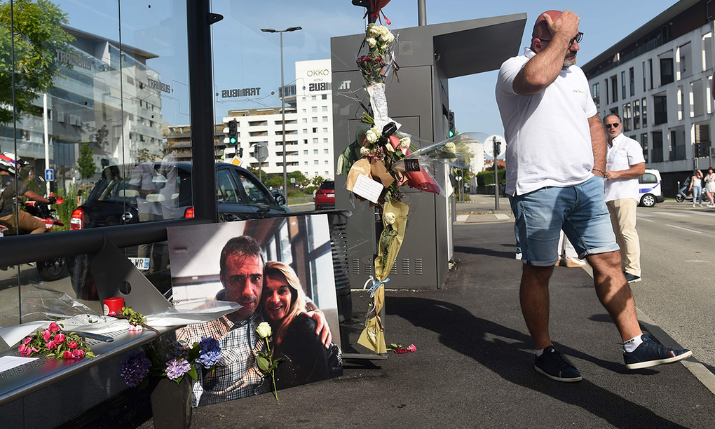 Ảnh và hoa tưởng niệm Philippe Monguillot ở điểm xe buýt tại thành phố Bayonne. Ảnh: AFP.