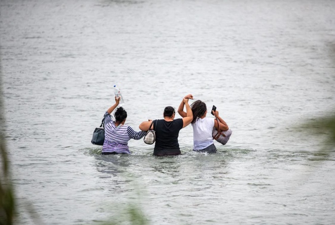 Một nhóm phụ nữ lội qua sông Rio Grande để vào Mỹ từ Mexico hồi tháng 4/2019. Ảnh: Washington Post.