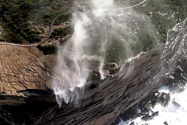 Cảnh tượng hiếm thấy khi một thác nước chảy ngược lên không trung ở miền nam Australia, khiến ai nấy đều ngỡ ngàng chứng kiến cảnh tượng hiếm thấy này trong lúc những đợt sóng lớn va đập dữ dội vào bờ đá phía dưới.