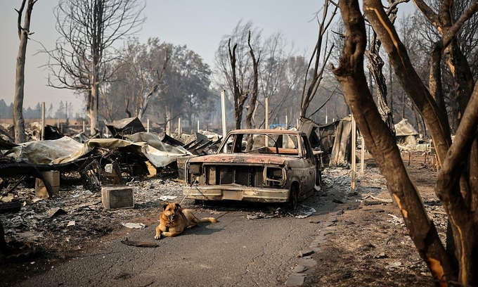 Chó bị xích vào một chiếc xe bị cháy trong một con phố bị cháy rừng tàn phá ở Phoneix, Oregon, Mỹ, hôm 10/9. Ảnh: Reuters.