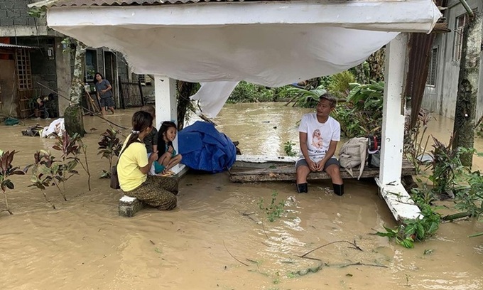 Người dân ngồi cạnh ngôi nhà bị ngập nước do bão Molave ở tỉnh Oriental Mindoro, Philippines, hôm 26/10. Ảnh: AFP.