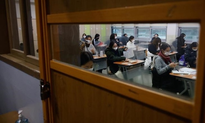 Học sinh chờ bắt đầu kỳ thi tuyển sinh đại học quốc gia tại một trường thi ở thủ đô Seoul, Hàn Quốc, ngày 3/12. Ảnh: AP.