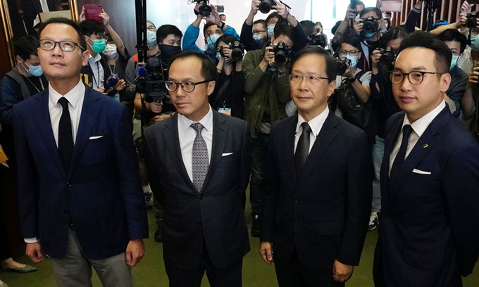 Các nghị sĩ đối lập Hong Kong trả lời báo chí tại Hội đồng Lập pháp sau khi bị bãi nhiệm tháng trước. Ảnh: AP.