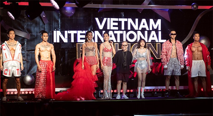 Nhà thiết kế Hà Nhật Tiến cùng hoa hậu Tiểu Vy và siêu mẫu Minh Tú ra chào khán giả khi kết màn.