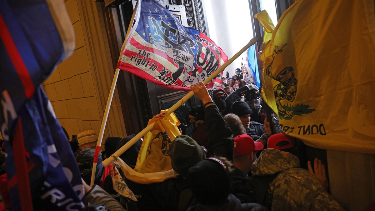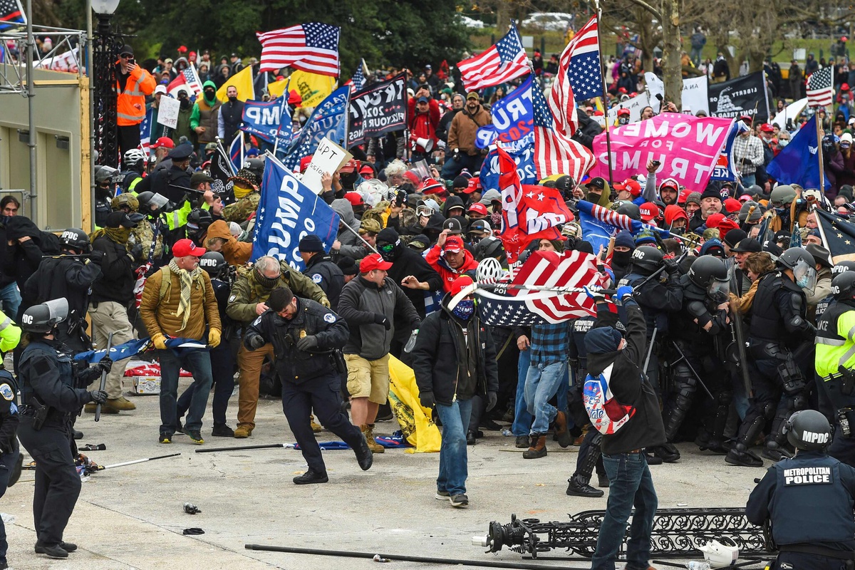 Chiều ngày 6/1, không lâu sau khi Tổng thống Trump phát biểu kêu gọi hàng nghìn người ủng hộ diễu hành về Quốc hội, đám đông mang cờ “Trump” đã kéo tới, trèo tường, đập vỡ cửa, và vượt qua cảnh sát để xông vào trong Điện Capitol.