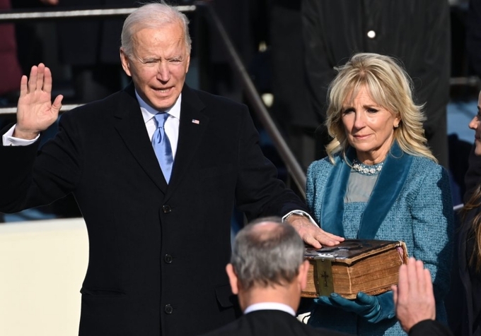 Tổng thống đắc cử Joe Biden tuyên thệ trước sự chứng kiến của Chánh án Tòa án Tối cao Mỹ John Roberts hôm 20/1. Ảnh: AFP.
