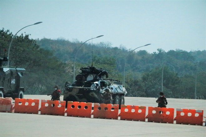 Xe thiết giáp được triển khai đến khu vực bên ngoài tòa nhà quốc hội Myanmar ở thủ đô Naypyitaw vào sáng 1/2. Ảnh: Reuters.