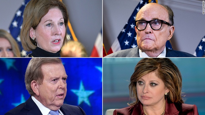 Bốn bị đơn trong vụ kiện của công ty Smartmatic, bao gồm hai luật sư Sidney Powell và Rudy Giuliani, cùng hai người dẫn chương trình Lou Dobbs và Maria Bartiromo của Fox News. Ảnh: Getty.