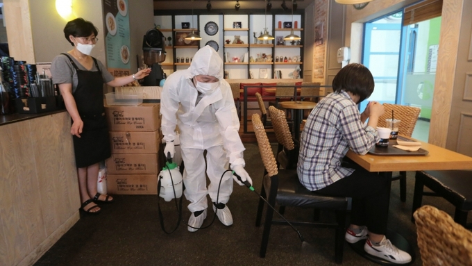 Nhân viên y tế phun khử khuẩn một quán cà phê tại Goyang, Hàn Quốc, hồi tháng 8/2020. Ảnh: AP.
