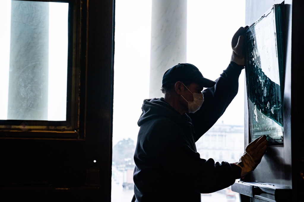 Nhân viên đang sửa chữa bên trong Điện Capitol ngay trước phiên xử luận tội. Ảnh: New York Times.