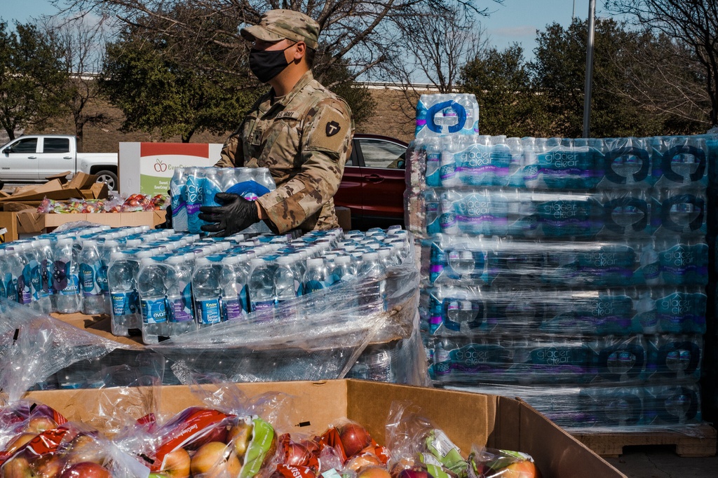 Lực lượng Vệ binh Quốc gia đã giúp phân phát thực phẩm và nước uống tại điểm phát thực phẩm từ thiện ở San Antonio. Ảnh: New York Times.
