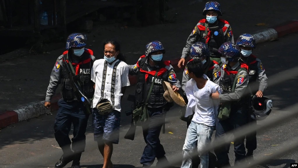 Cảnh sát bắt người biểu tình tại Yangon, Myanmar, ngày 27/2/ 2021.