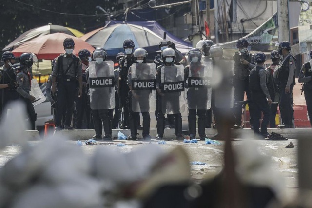 Lực lượng an ninh Myanmar đối phó người biểu tình phản đối đảo chính (Ảnh: EPA).