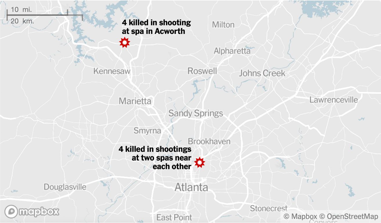 Vào thứ 3 ngày 16/3/2021 (giờ địa phương), 8 người đã bị giết vì xả súng ở 3 cơ sở kinh doanh dịch vụ massage ở Atlanta và gần hạt Cherokee (Georgia, Mỹ). 6 trong số 8 nạn nhân là người gốc châu Á, 2 người da trắng. 7 người trong số họ là phụ nữ. Kẻ tình nghi trong vụ tấn công được xác định là Robert Aaron Long, 21 tuổi, người da trắng.