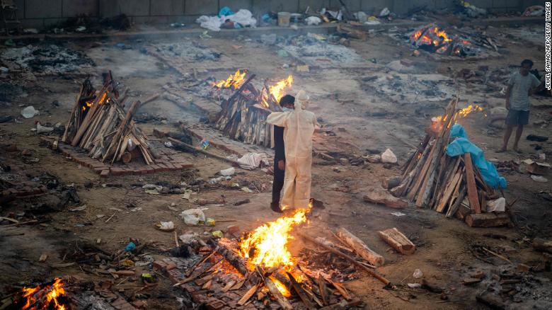 Một điểm hỏa thiêu thi thể bệnh nhân Covid-19 ngoài trời tại Ấn Độ.