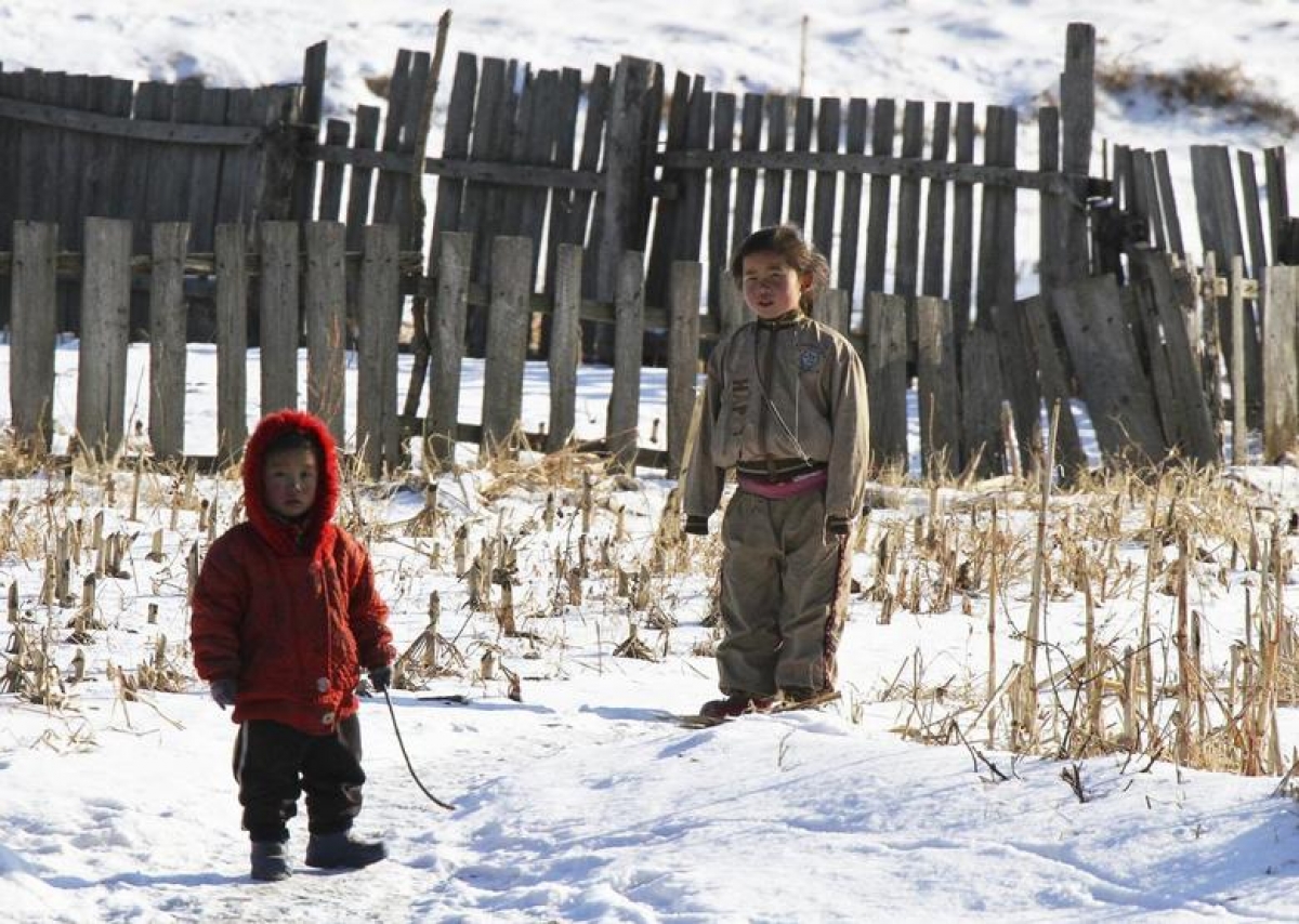 Trẻ em Triều Tiên nghịch tuyết bên bờ sông Yalu, tỉnh Sakchu ngày 17/12/2014. Ảnh: Reuters