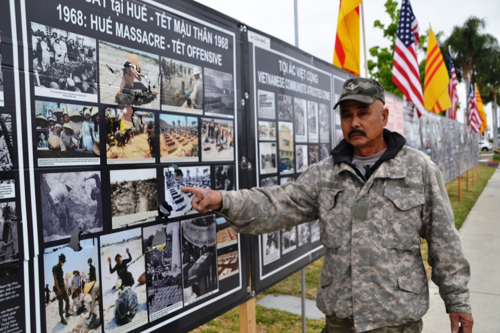 Anh Vũ Long Sơn Hải chỉ cho chúng tôi xem, trên tấm bia đen ghi hình ảnh tố giác tội ác Việt Cộng và những sinh hoạt đấu tranh của người Việt khắp nơi đã bị xé rách hoặc đâm thủng, một lá cờ Quốc Gia Việt Nam (cờ vàng) treo trên cột cờ bị lấy xuống và đem sang phía bên kia đường để trước một văn phòng thương mại. Ông Lê Quang Dật và hai vị khác đã sang thu hồi lá cờ.