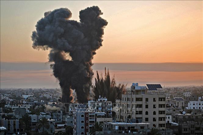 Khói lửa bốc lên sau loạt không kích của Israel xuống Dải Gaza ngày 11/5/2021. Ảnh: AFP/TTXVN