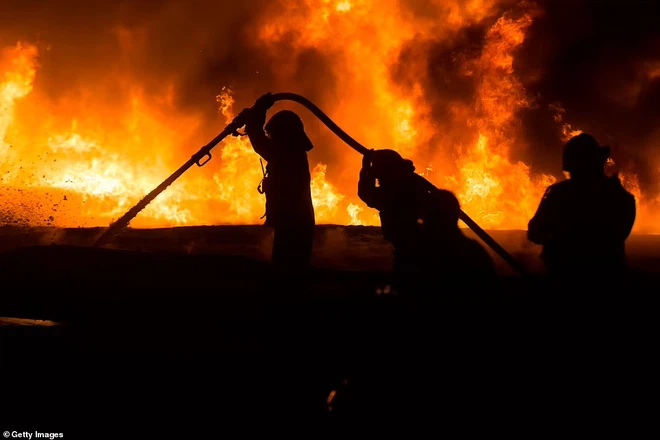 Lực lượng cứu hỏa Israel gồng mình dập một đám cháy sau khi một tên lửa phóng từ dải Gaza rơi xuống Ramla đêm 13/5.