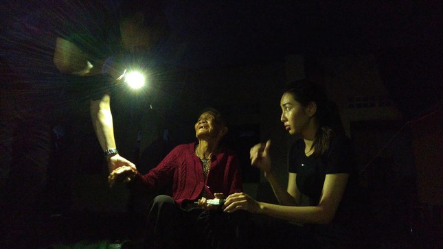 Bà cụ ngồi một mình dưới mái bạt cạnh căn nhà đổ nát, quang cảnh tối om, mưa lại sắp đổ xuống. Chủ tịch UBND thành phố Quảng Ngãi là ông Hà Hoàng Việt Phương phải bật đèn pin điện thoại lấy ánh sáng để chúng tôi trao tiền.