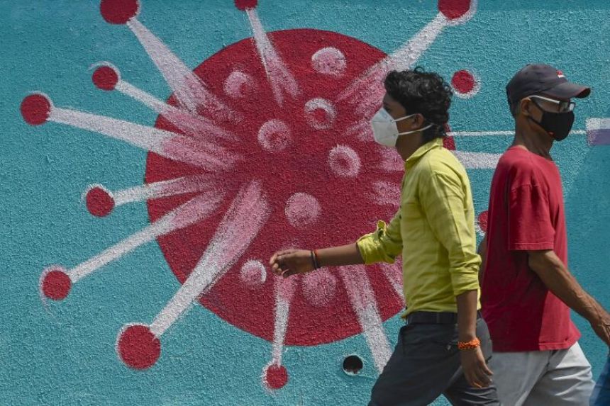 Hình vẽ SARS-CoV-2 trên tường ở Mumbai, Ấn Độ. Ảnh: AFP