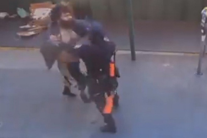 Người đàn ông 33 tuổi ban đầu quay người lại theo mệnh lệnh, nhưng trong lúc nữ cảnh sát đeo găng tay, anh ta quay lại, xô ngã cô, rồi hai người giằng co trên mặt đất.