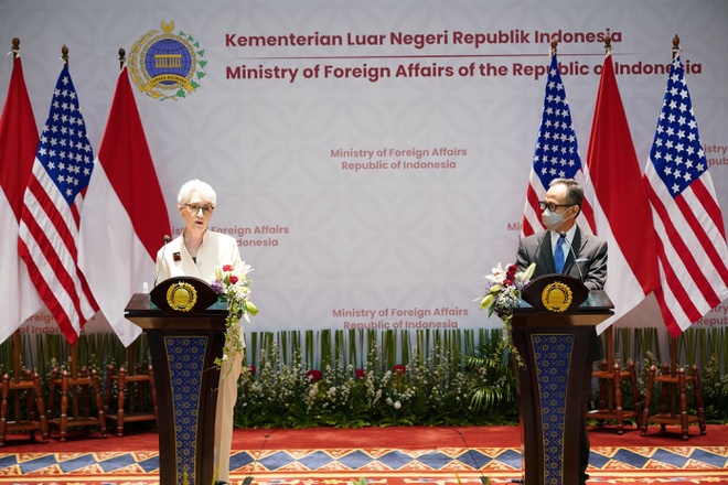Thứ trưởng Bộ Ngoại giao Mỹ Wendy Sherman tham gia họp báo với người đồng cấp Indonesia. Ảnh: Reuters.