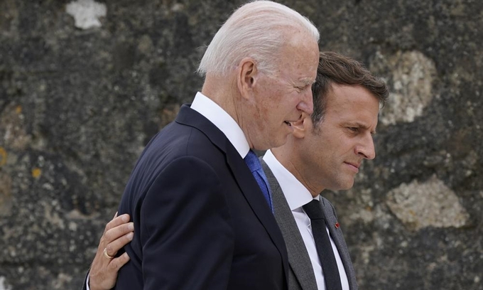 Tổng thống Pháp Emmanuel Macron (phải) và Tổng thống Mỹ Joe Biden tại hội nghị G7 ở Cornwall, Anh ngày 11/6. Ảnh: Reuters.