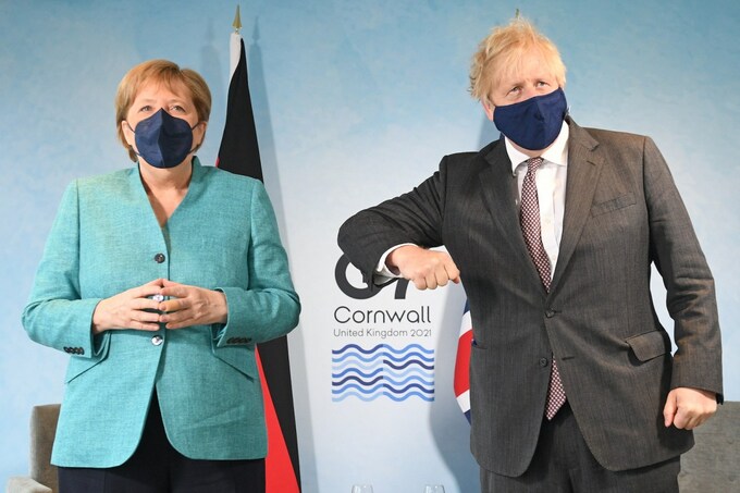 Thủ tướng Đức Merkel (trái) cùng người đồng cấp Anh Boris Johnson tại hội nghị G7 ở Cornwall, Anh, hôm 12/6. Ảnh: AFP.
