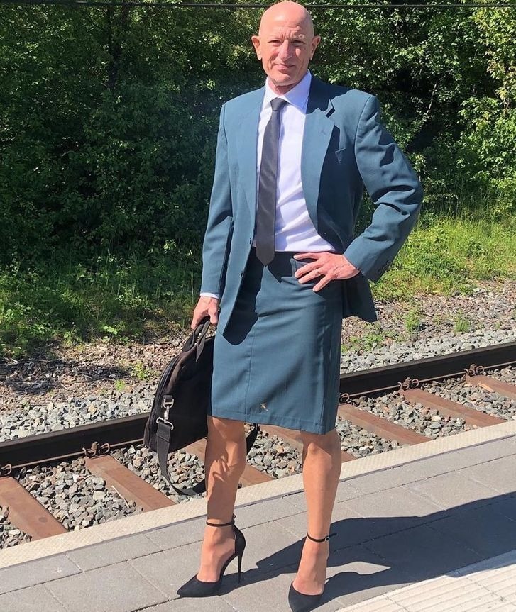 Mark Bryan, 62 tuổi, thích mặc váy cùng giày cao gót khi đi làm hàng ngày ở Đức.