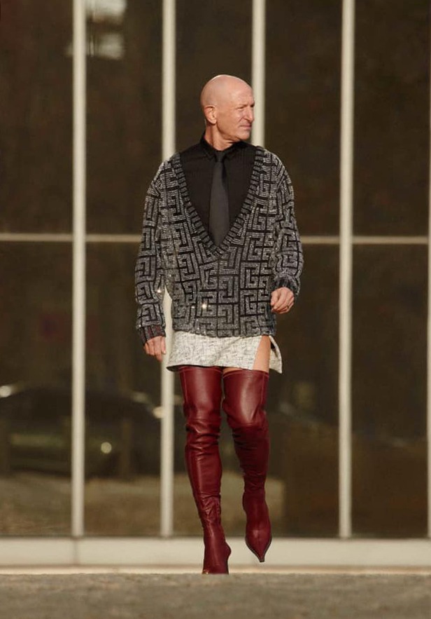 Mark mặc áo len, sơ mi và cà vạt của Balmain, phối chân váy Coperni, mang bốt da cao trên đầu gối.