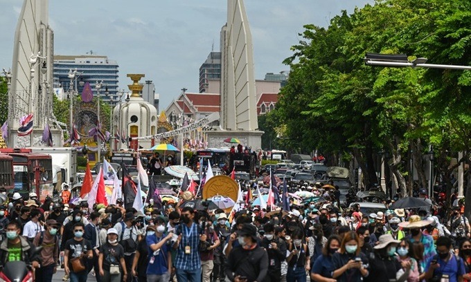 Hàng trăm người biểu tình tuần hành hôm nay ở thủ đô Bangkok để phản đối chính phủ, bất chấp cảnh báo về ca Covid-19 đang tăng nhanh trong nước.